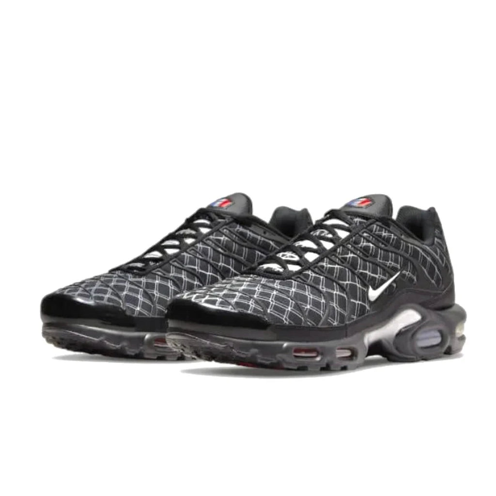 Το Nike Air Max Plus France παρουσιάζει μια κομψή μαύρη βάση διακοσμημένη με ένα εντυπωσιακό λευκό σχέδιο πλέγματος, που θυμίζει τα χωρίσματα που βρίσκονται κοντά σε πάρκα και παιδικές χαρές σε ορισμένες γειτονιές. Υπάρχουν και άλλες αναφορές στη Γαλλία. Μπορεί κανείς να διακρίνει τους αριθμούς 9 και 3 στις καρτέλες της γλώσσας, σε ένα παιχνιδιάρικο νεύμα στην περιοχή Seine-Saint-Denis όπου αυτό το ζευγάρι αθλητικά παπούτσια σημείωσε τεράστια επιτυχία. Στην κορυφή κάθε γλώσσας, μια διακριτική γαλλική σημαία είναι κομψά ενσωματωμένη πίσω από το εμβληματικό λογότυπο Swoosh.
